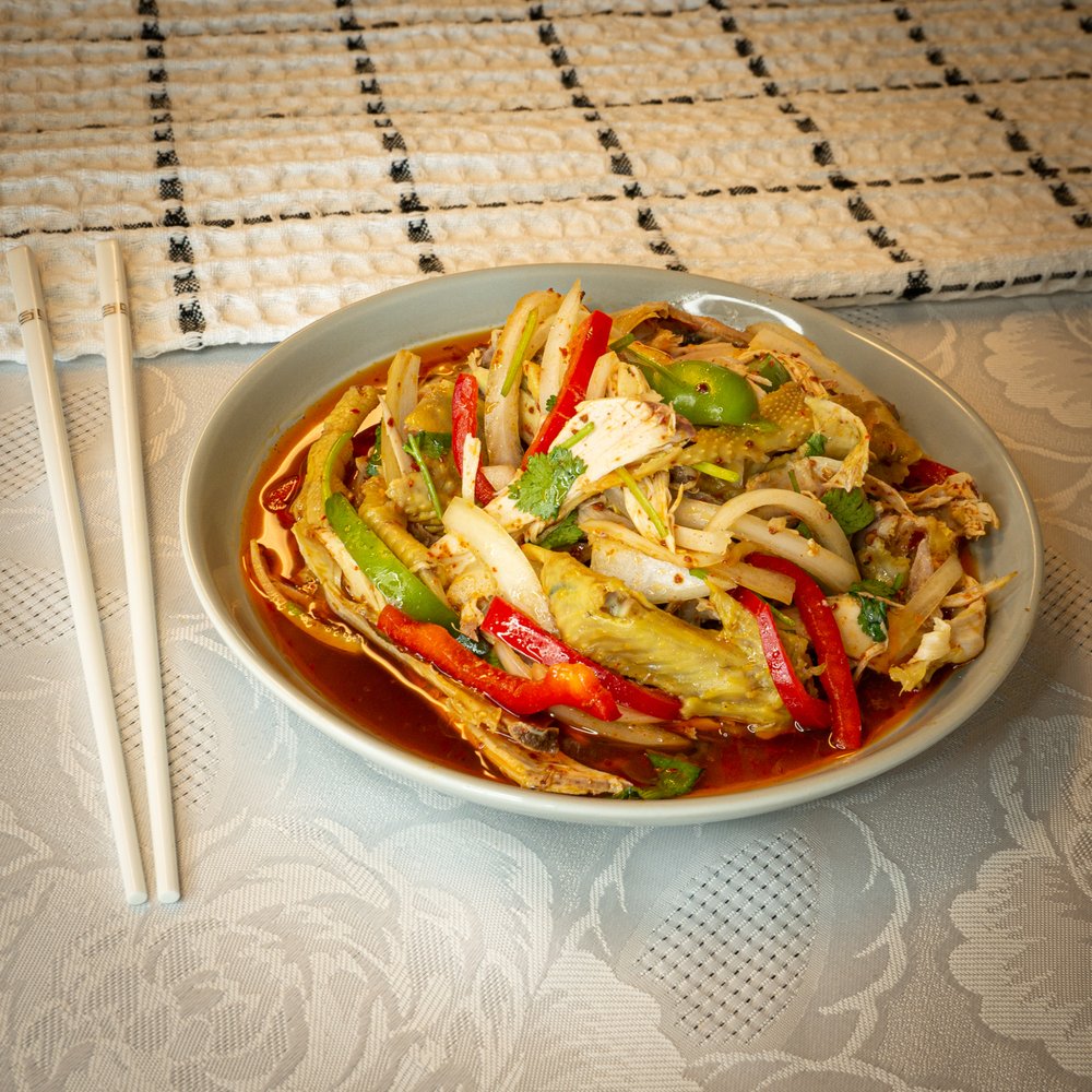 Ingredients: brown chicken, cilantro, red bell pepper, green bell pepper, chili oil, homemade chicken soup base with Sichuan peppercorns and rattan pepper.